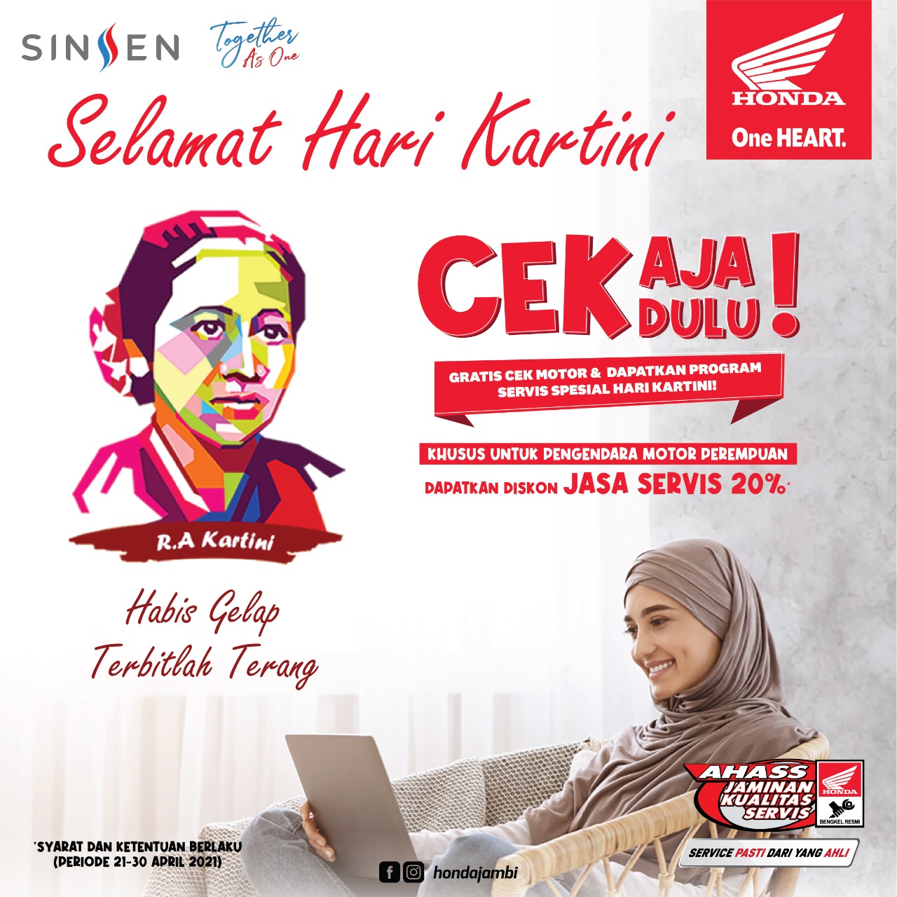 GM Marketing Operations Sinsen Erwin Susanto mengatakan promo Hari Kartini ini merupakan program kolaborasi bersama program Cek Aja Dulu di AHASS, yaitu layanan pengecekan gratis untuk minimal 7 (tujuh) item part dengan minimal estimasi pengerjaannya 20 menit. Adapun 7 item part tersebut adalah Check Oli, Check Spark Plug, Check Brake System, Check Lighting System, Check Battery, Check Tire, dan Check Chain Drive.