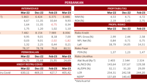 Di sisi profitabilitas, secara umum peningkatan laba bank triwulan I 2023 ini masih sejalan dengan proyeksi Rencana Bisnis Bank 2023 yang terutama didorong oleh pertumbuhan kredit dan fee based income serta perbaikan kinerja surat berharga. Selain itu, pertumbuhan ini juga seiring dengan ekspektasi pertumbuhan ekonomi Indonesia yang mencapai sekitar 5 persen.