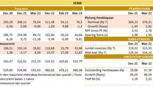 Pada sektor IKNB, akumulasi pendapatan premi sektor asuransi selama periode Januari sampai dengan Maret 2023 mencapai Rp78,50 triliun, atau terkontraksi sebesar 1,33 persen dibandingkan periode yang sama pada tahun sebelumnya (Februari 2023: 9,88 persen). Demikian pula halnya dengan pertumbuhan akumulasi premi asuransi jiwa terkontraksi sebesar -9,81 persen yoy, dengan nilai sebesar Rp44,84 triliun per Maret 2023 didorong oleh penurunan premi di lini usaha PAYDI. Namun demikian, akumulasi premi asuransi umum masih tumbuh positif 12,87 persen yoy (Februari 2023: 27,56 persen), menjadi Rp33,66 triliun. Normalisasi kinerja pertumbuhan premi dari lini usaha PAYDI tersebut telah diantisipasi oleh OJK dan merupakan bagian dari tahapan reformasi yang dilakukan OJK pada sektor industri asuransi, sehingga pemasaran dan pengelolaan produk asuransi dapat berjalan secara lebih prudent, fair, dan transparan.