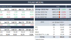Pasar saham di April 2023 menguat 1,62 persen mtd ke level 6.915,72 (Maret 2023: -0,55 persen mtd di level 6.805), dengan non-resident mencatatkan inflow sebesar Rp12,29 triliun mtd (Maret 2023: Rp4,12 triliun mtd). Secara ytd, IHSG tercatat menguat sebesar 0,95 persen dengan non-resident membukukan net buy sebesar Rp18,91 triliun (Maret 2023: net buy sebesar 6,62 triliun ytd).
