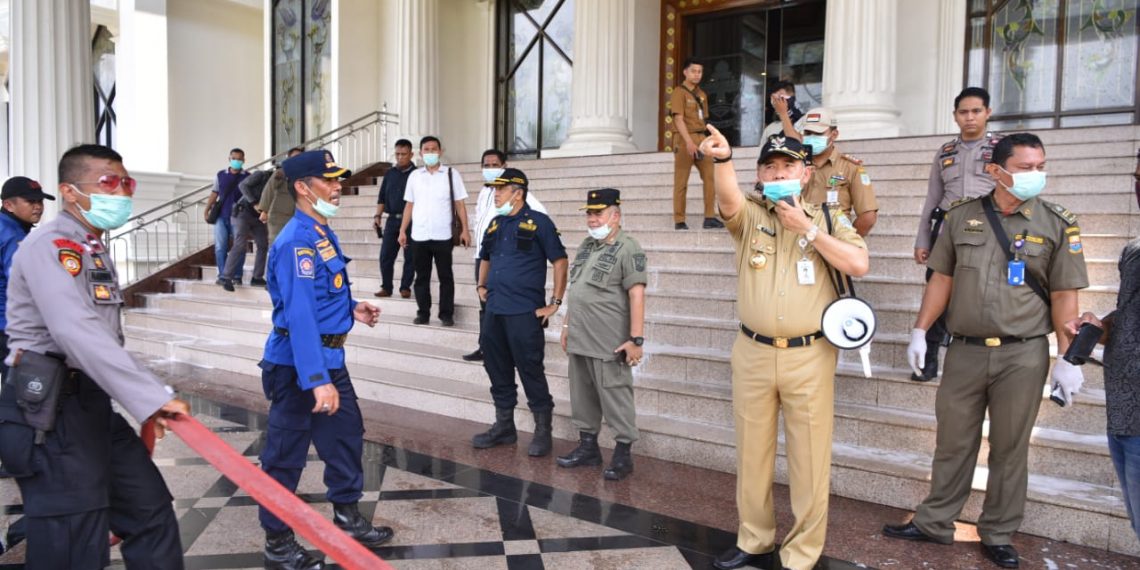 Bermodalkan pengeras suara, Wali Kota Jambi Syarif Fasha memimpin langsung proses penyemprotan berbagai bangunan perkantoran yang berada di kawasan perkantoran kantor Gubernur tersebut. Turut mendampingi Fasha, Kapolresta Jambi Kombes Pol. Dover Christian, S.Ik.