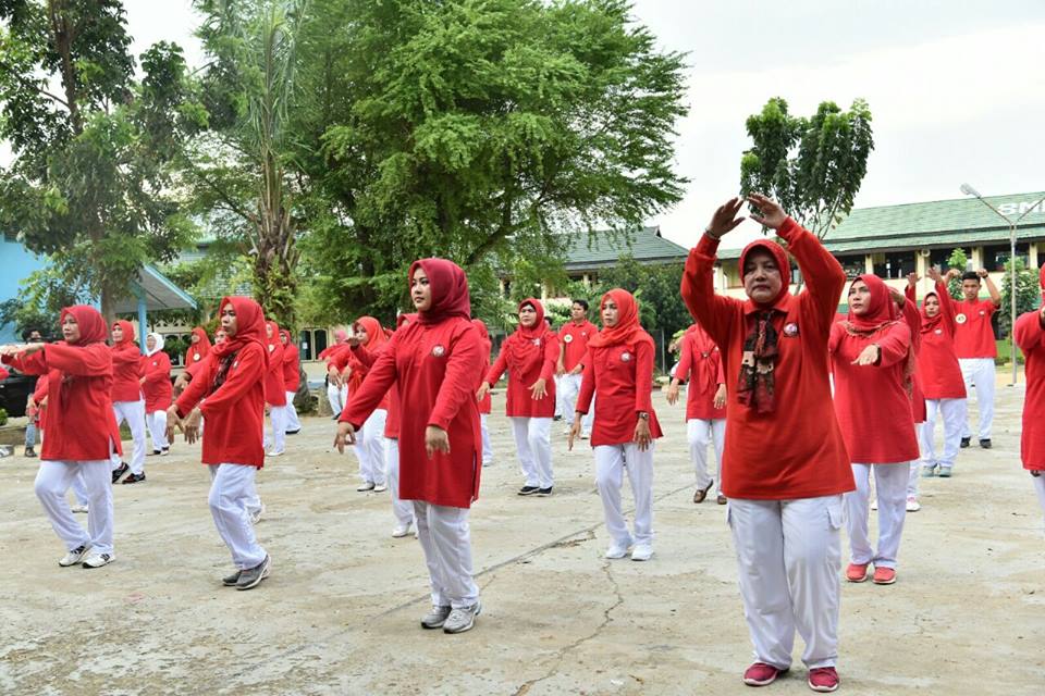 Sebelum lomba senam tera dimulai, Sherrin bersama Juniwati dan para peserta lomba, melakukan senam tera bersama. (Richi)