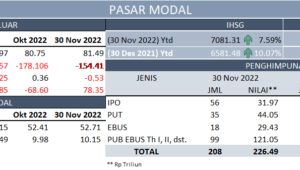 Pasar saham hingga akhir November 2022 melemah 0,25 persen mtd ke level 7.081,31 dengan non-resident mencatatkan inflow sebesar Rp0,74 triliun mtd. Secara ytd, IHSG tercatat menguat sebesar 7,59 persen dengan non-resident membukukan net buy sebesar Rp81,49 triliun.