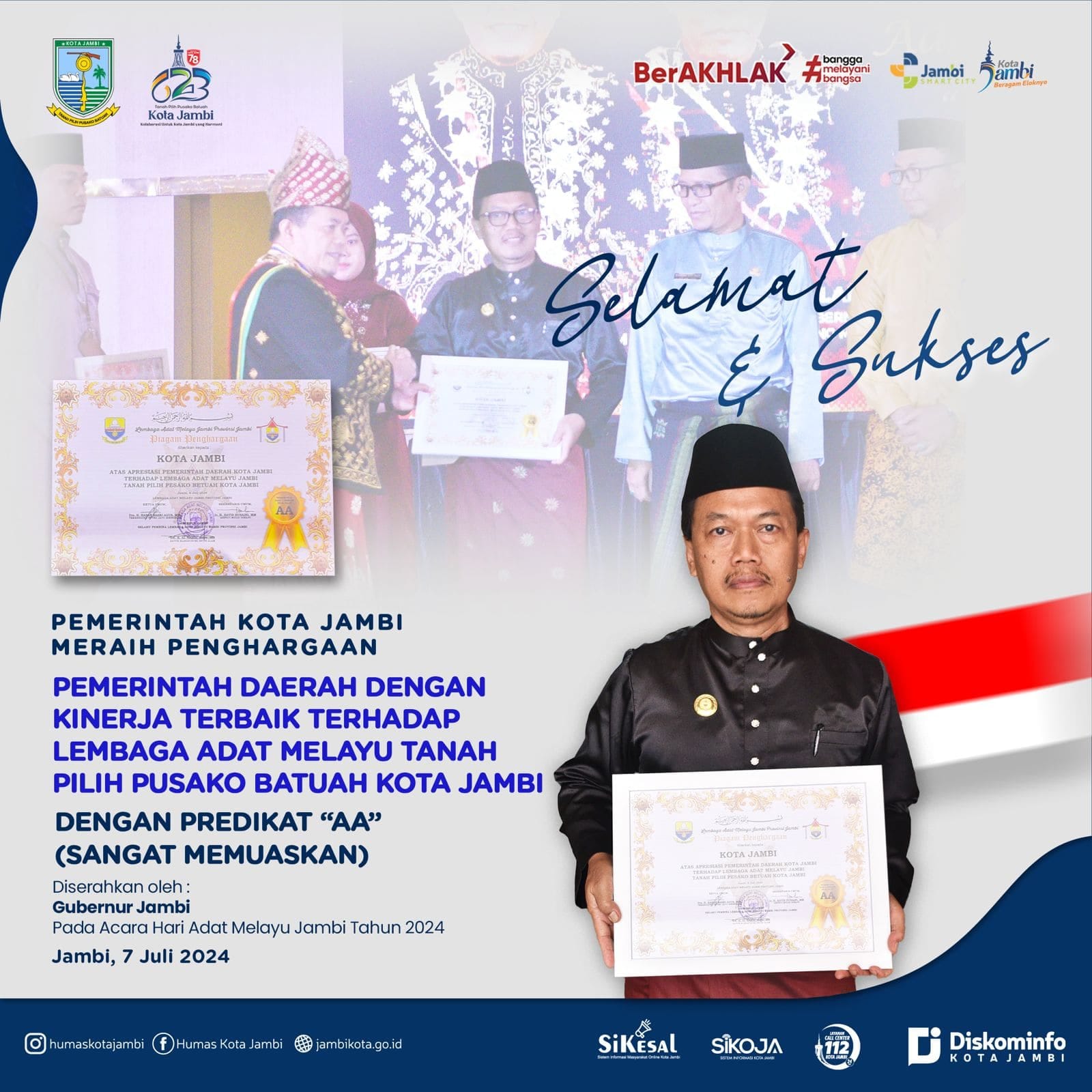 Penghargaan tersebut diserahkan Gubernur Jambi Alharis dan diterima oleh Asisten Administrasi Umum Setda Kota Jambi Jaelani mewakili Pj Wali Kota Jambi dalam acara peringatan Hari Adat Melayu Jambi yang berlangsung di Abadi Convention Center Jambi, Minggu (07/7/2024).