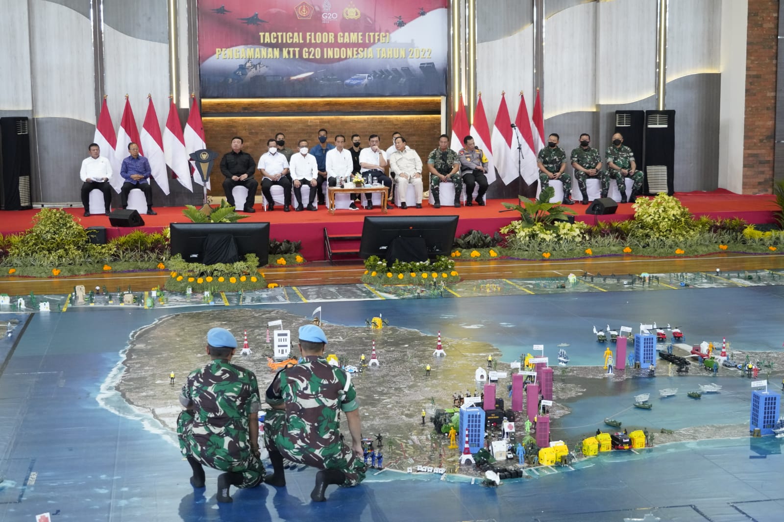 Denpasar (WARTANEWS.CO) – Presiden RI, Ir. H. Joko Widodo meninjau pelaksanaan kegiatan Tactical Floor Game (TFG) Pengamanan KTT G20 tingkat Mabes TNI yang dipimpin langsung oleh Panglima TNI Jenderal TNI Andika Perkasa, bertempat di GOR Praja Raksaka, Kepaon, Denpasar, pada Rabu (09/11/2022).