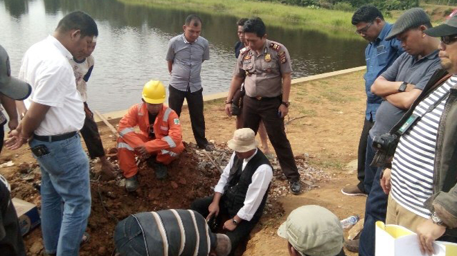 Menindak Lanjuti Laporan Polisi, Penyidik Polda Jambi yang dipimpin Kanit II Subdit III Krimsus Polda Jambi AKP Anders, Unit Tipikor Polres Tebo Ipda Fernando Gultom,SH ,Tim BPK RI Perwakilan Jambi Johan dan Ahli Konstruksi Bangunan dari ITB Ir Hermawan melakukan Identifikasi Kontruksi Bangunan Embung yang berada di Desa Sungai Abang VII Koto, jumat (2/2).