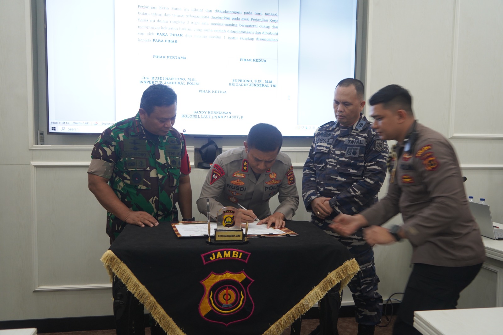 Hal ini ditandai dengan penandatanganan Nota kesepakatan perjanjian kerja sama antara TNI yaitu Korem 042/Gapu serta Pangkalan TNI Angkatan Laut Palembang dan Polri yaitu Polda Jambi, bertempat di Ruang Coffee Morning Polda Jambi yang dihadiri para PJU Polda Jambi, PJU Korem 042/Gapu dan perwakilan dari Lanal Jambi, Jum’at (20/10/2023).