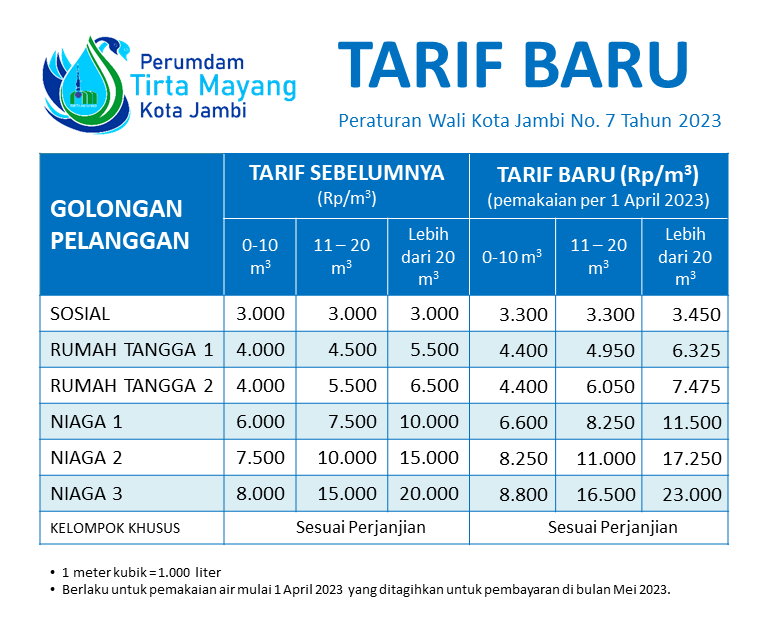 Dijelaskan pula oleh Dirut Tirta Mayang bahwa kenaikan tarif untuk golongan Rumah Tangga 2, Niaga 1, Niaga 2, dan Niaga 3 tetap berlaku terhitung mulai pemakaian bulan april 2023 yang ditagihkan pada bulan Mei ini.