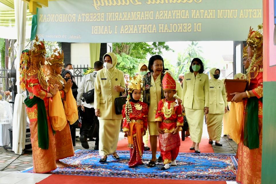 Kunjungan Ketua Umum IAD, Sruningwati Burhanuddin langsung disambut Ketua Ikatan Adhyaksa Dharmakarini Wilayah Jambi Ny. Tiana Elan Suherlan beserta anggota, Ketua Harian Yayasan IAD Edi Iskandar serta, Kepala Sekolah TK Adhyaksa Zulpah dan para guru.