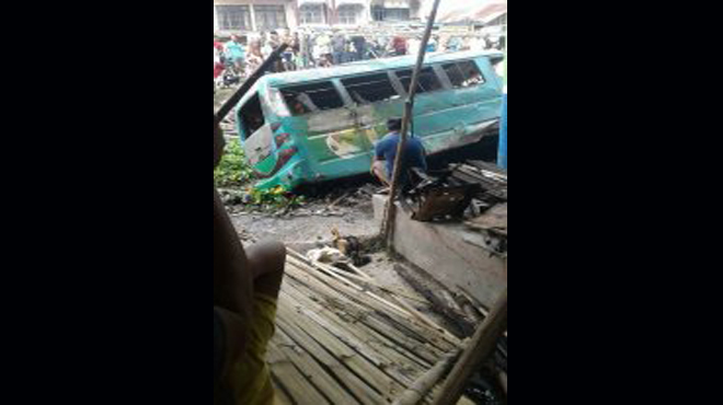 Informasi yang berhasil dikumpulkan wartanews.co dilokasi, travel SKW dari arah Padang dengan kecepatan tinggi , tepat di Pasar Senen pecah ban bagian kiri depan. Sopir terpaksa membanting setir hingga bus oleng kekiri dan jatuh dari badan jalan. Mobil menambrak pondok tempat berjualan warga mengakibatkan bus terbakar.