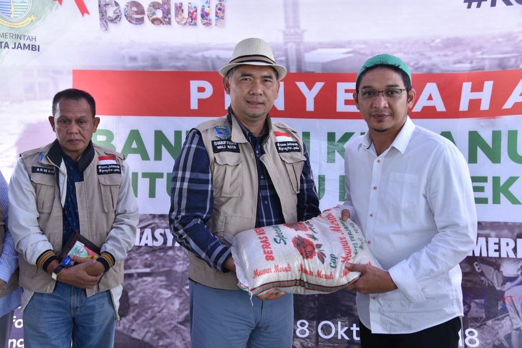 JAMBI (WARTANEWS.CO) – Alhamdulillah, bantuan masyarakat Jambi sudah disampaikan langsung oleh Wali Kota Jambi DR. H. Syarif Fasha, ME kepada Wakil Wali Kota Palu, Sigit Purnomo (Pasha Ungu). Bantuan tahap I senilai Rp. 715.000.000,- diserahkan secara simbolis. Semoga kepedulian masyarakat Jambi dapat sedikit mengurangi beban saudara kita di Palu dan sekitarnya.